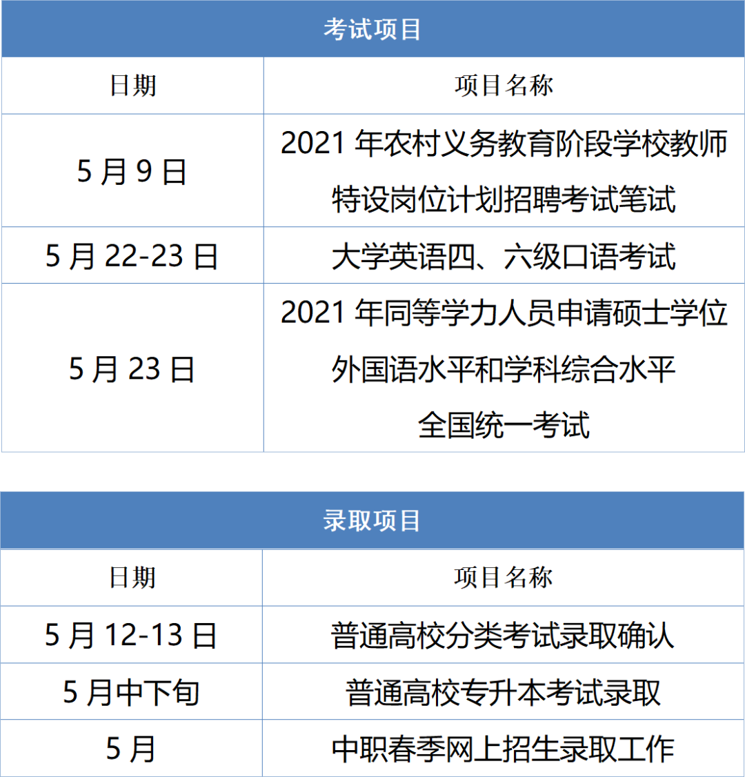以上就是关于2021年5月安徽省教育招生考试月历简要介绍了,希望大家在2021年安徽专升本能够取得自己心仪的成绩。如有更多想要知道安徽专升本考试的相关资讯,如专升本招生院校、考试动态、招生专业等。敬请关注安徽专升本(www.ahsxez.com)。