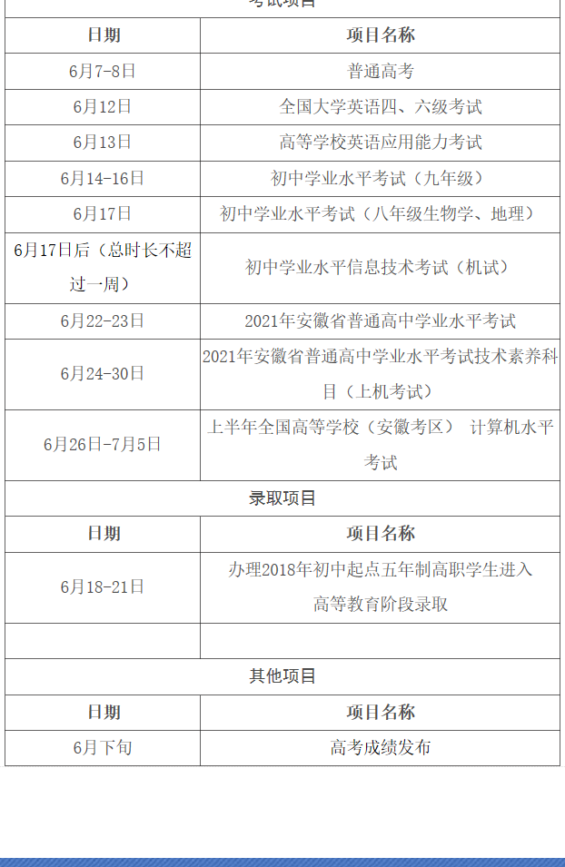 以上就是关于2021年6月教育招生考试月历简要介绍了,希望大家在2021年安徽专升本能够取得自己心仪的成绩。如有更多想要知道安徽专升本考试的相关资讯,如专升本招生院校、考试动态、招生专业等。敬请关注安徽专升本(www.ahsxez.com)。