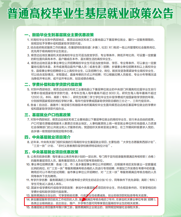 但是,今年初教育部发布的一个通知让我们看到了转机。2022年3月25日教育部发布了一份《关于开展2022年高校毕业生就业创业政策宣传月活动的通知》,在这份通知的附件——普通高校毕业生基层就业政策公告中提到参加中央基层就业项目后在升学等方面可享受应届高校毕业生等相关政策。