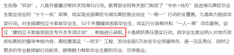 例如:建档立卡专项计划。2020年之前,全国绝大部分省份专升本是没有建档立卡这个专项政策的,但是2020年5月6日,教育部在高校毕业生就业创业“百日冲刺”十大专项行动中提出之后,基本各省份从2020年起都陆续设立了建档立卡专项计划。
