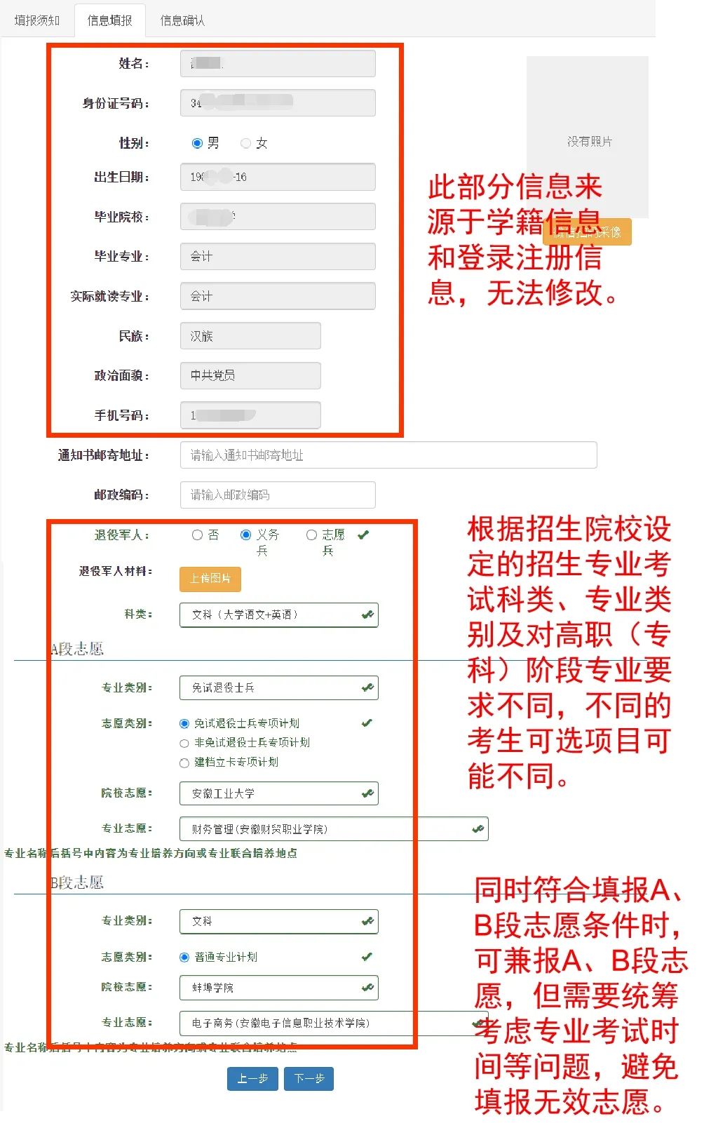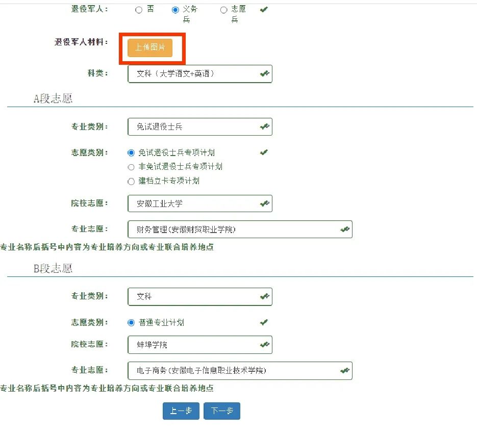 往届退役士兵报名前请提前联系就读的高职(专科)院校办理学籍登记等,报名流程与其他考生相同。在填报时须根据自身情况选择“义务兵”或“志愿兵”。