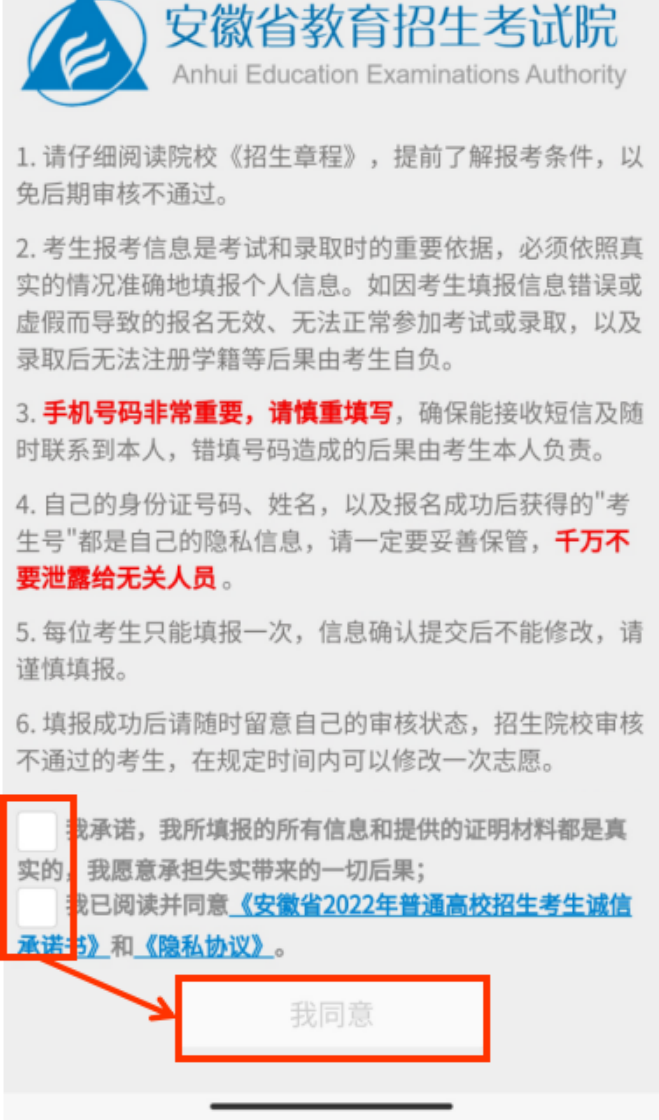 请仔细阅读《填报须知》中所有内容,包括《安徽省2023年普通高校招生考生考试诚信承诺书》和《隐私协议》。确认了解所有信息后,勾选复选框,点击“我同意”按钮。