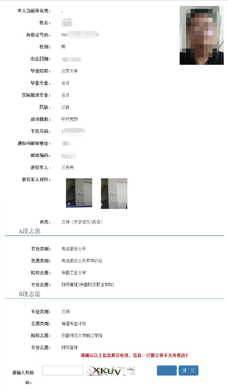 务必再次检查自己填(选)的内容是否有误,如有,返回修改。确定无误后,填入校验码,点击“提交”按钮即可提交信息。