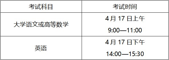 考试科目分省考试院组织的统考科目和由招生院校组织的专业课科目两大类。招生考试实行“2门公共课(各150分)+2门专业课(各150分)”的测试方式,考试科目分文理科,文科2门公共课为“大学语文+英语”,理科2门公共课为“高等数学+英语”,2门专业课为高职(专科)阶段专业课程。公共课由省考试院组织进行统考。专业课由高校自主命题或开展联合命题,并组织考试。招生院校确定招生专业统考科类、专业课考试科目,并在招生章程中公布。