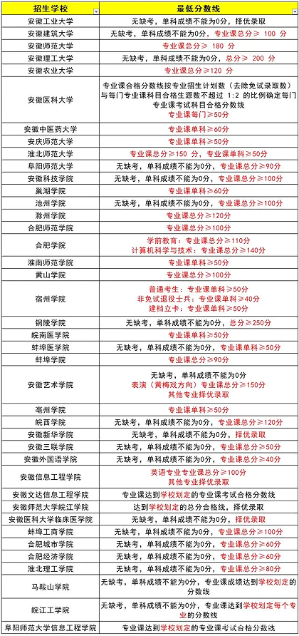 安徽医科大学、安徽文达信息工程学院、安徽师范大学皖江学院、马鞍山学院、皖江工学院、阜阳师范大学信息工程学院。该6所学校在招生简章中说明:在达到公共课省控线和学校划定的考试合格线的基础上择优录取,这个考试合格线的划定方式,简单讲,就是按招生计划数与上线合格数的一定比例确定校控线。
