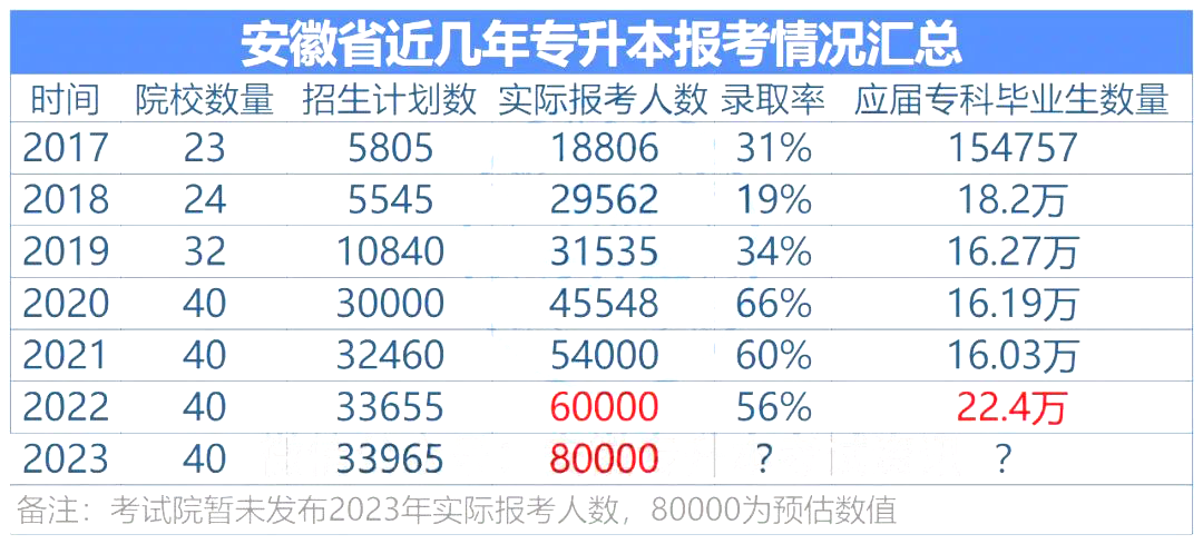 从2020年安徽专升本扩招政策以来,除第一年招生名额大跃进式提升外,每年招生名额增长并不大,但与之形成对比的是报考人数的大幅提升。