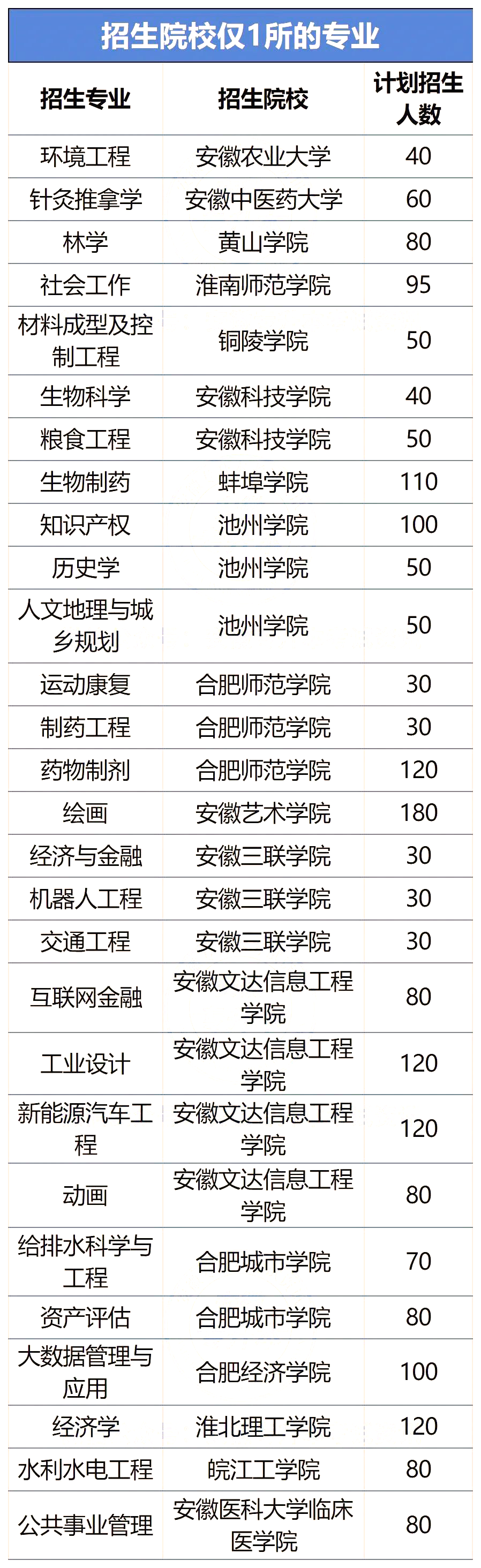 以上就是关于2024年安徽专升本这些专业仅有一所院校招生的简要介绍了,希望大家在2024年安徽专升本能够取得自己心仪的成绩。如有更多想要知道安徽专升本院校的相关资讯,如安徽专升本招生学校、考试动态、招生专业等。敬请关注安徽专升本(www.ahsxez.com)。