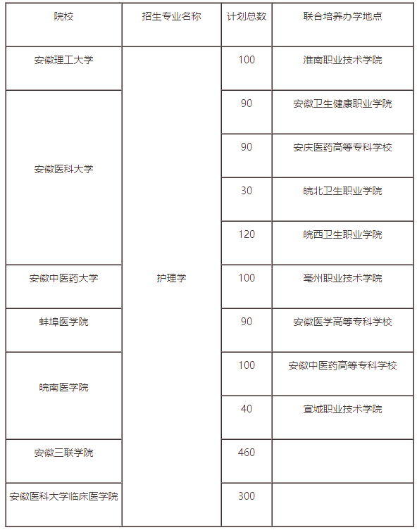 2023年安徽专升本护理学有7所院校招生,招生人数合计1520人。其中联合培养人数占了760人,只有安徽三联学院和安徽医科大学临床医学院是本部招生计划。