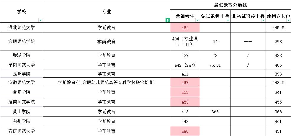 教育类的卷不用说了,安徽师范大学学前教育最低录取分数线497分,安庆师范大学学前教育分数线486分,淮北师范大学学前教育最低录取分数线484分。