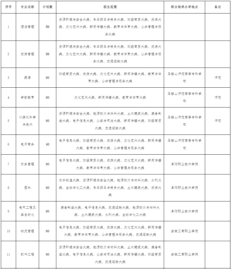 2023年马鞍山学院专升本分专业招生计划