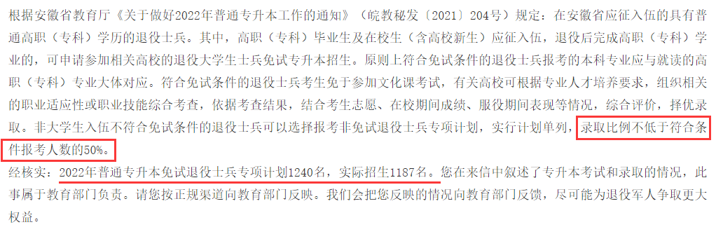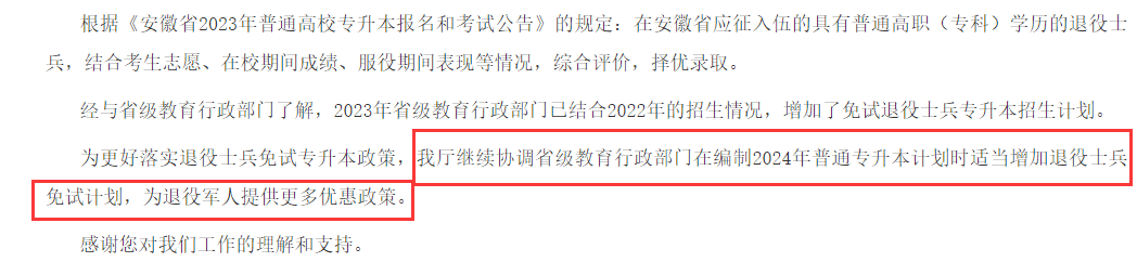 近期安徽省退役军人事务厅对退役士兵专升本问题作出回应,并明确表明2024年专升本计划适当增加退役士兵免试计划,为退役军人提供更多优惠政策。