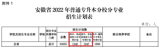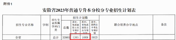 23年退役士兵招生计划:2023年安徽专升本计划招生33965人,其中免试退役士兵专项计划招生1265人,非免试退役士兵专项计划1069人,建档立卡考生专项计划1923人。