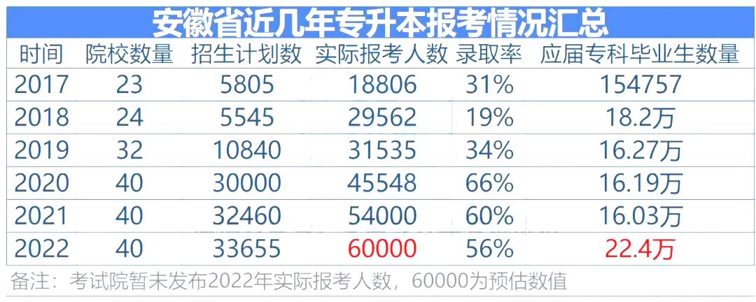 由于社会对学历的重视,用人单位用人门槛不断提高,从2017年开始,安徽专升本的报考人数增长飞快。由于省招生考试院并未发布今年的实际报考人数,因此小编根据往年数据保守推测今年有60000+人报考(实际人数应该是接近70000)。因为今年光是应届专科毕业生的数量就比去年增加了6.37万,基数更大了,其中选择专升本的毕业生应该更多。