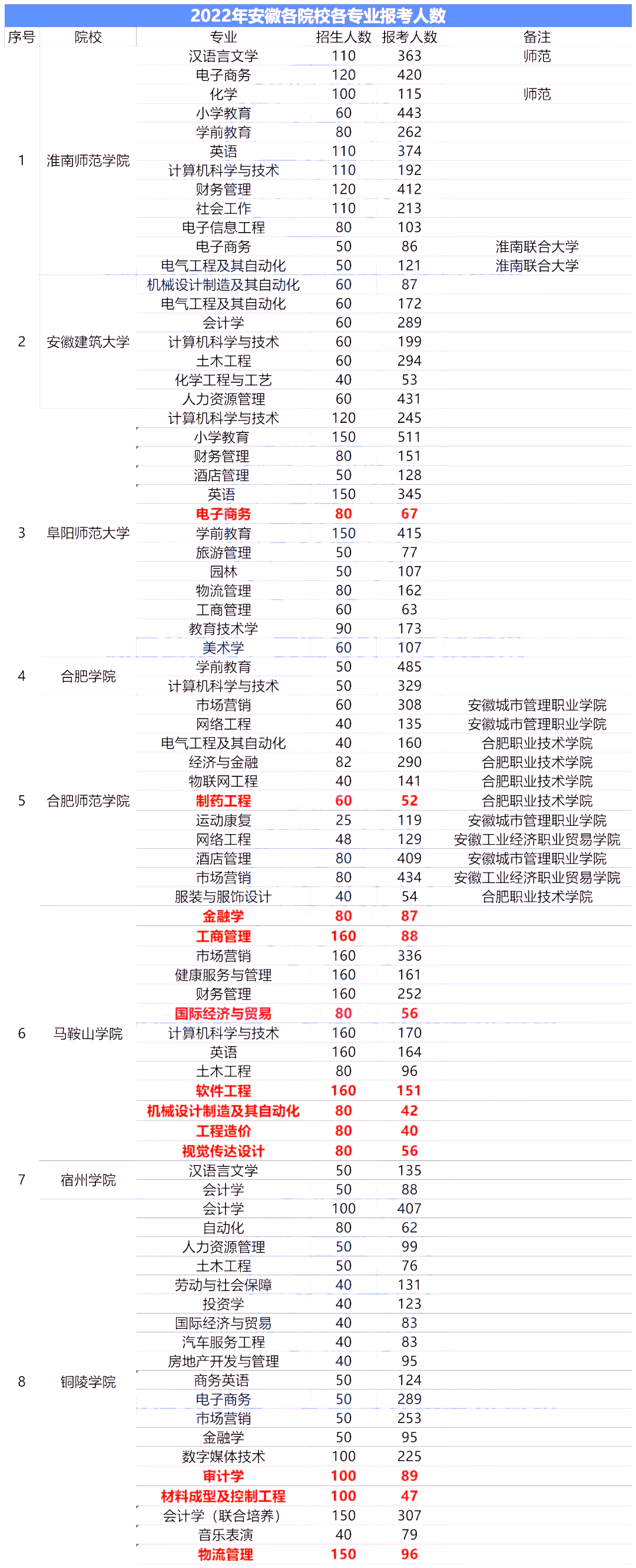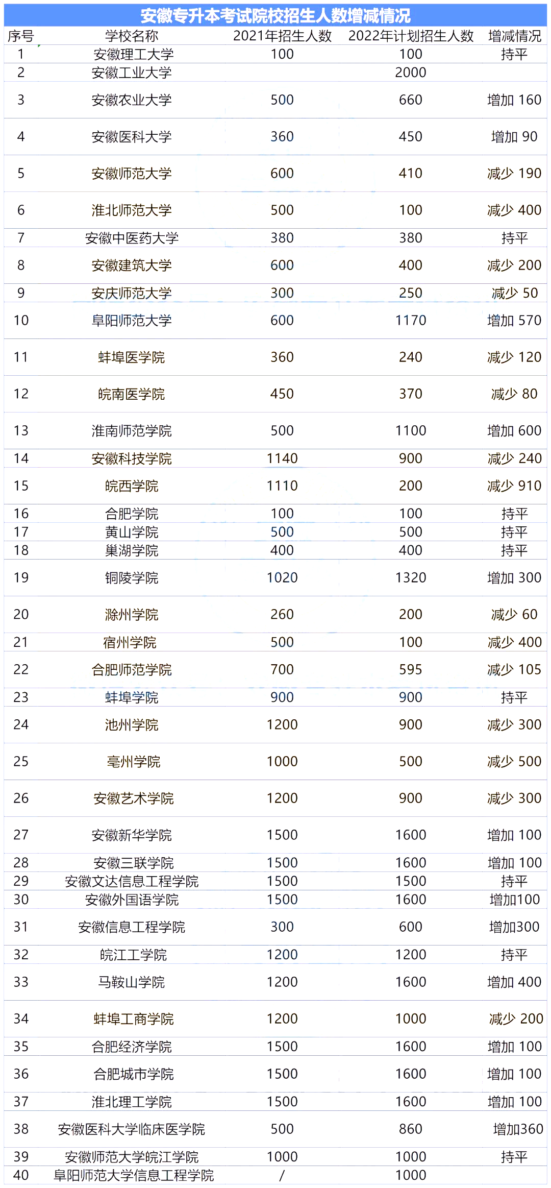2020年安徽扩招了19160人2021年安徽扩招了2460人2022年安徽仅扩招了1195主要是由于目前省内能参与的院校基本都已经加入了专升本的招生队伍。2017年参与招生的院校只有23所,近3年都是40所院校,增长了近一倍。1、未来这种扩招的速度大概率会继续保持;2、未来扩招的院校也以民办院校或职业大学为主,部分公办院校甚至会缩招甚至是不招(2022年安徽财经大学就退出了招生);2022年一本院校共计招生6070人,其中联合培养名额4740人,本校培养名额1330人,而2021年是2900人。而二本院校也缩招了17%。