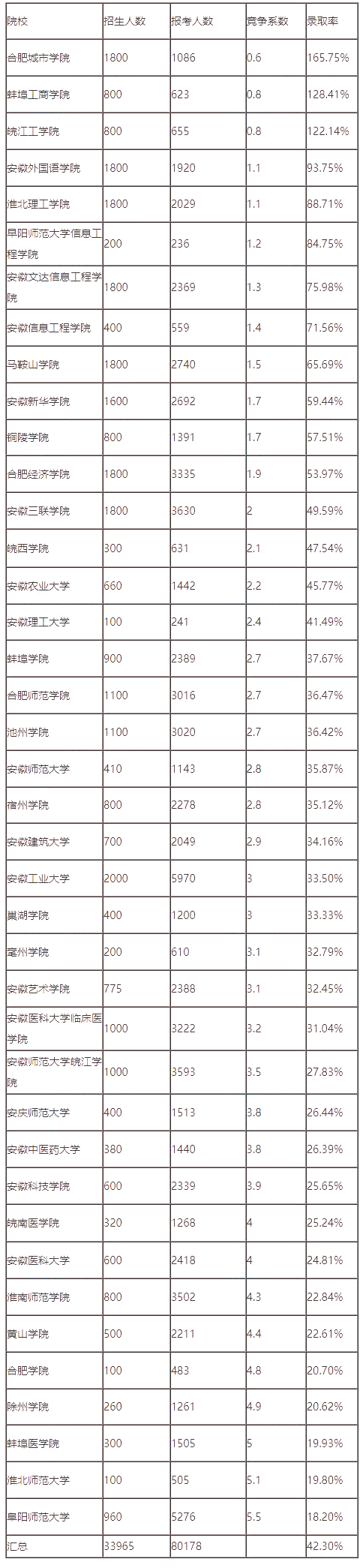 而今年竞争系数最大的院校,是阜阳师范大学,计划招生人数只有960人,但报考人数却达到了5276人,竞争系数达到惊人的5.5,录取率也是最低的只有18.20%。
