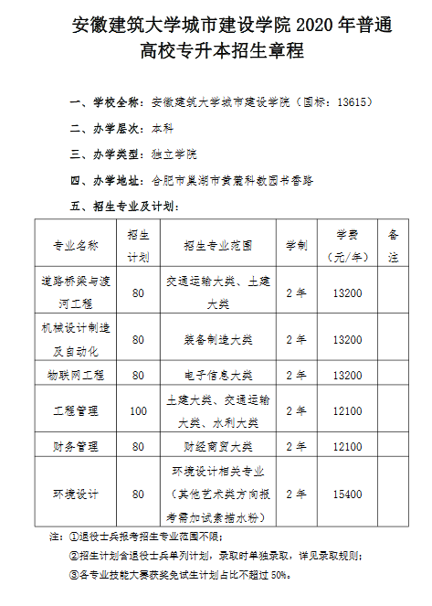 安徽建筑大学城市建设学院2020年普通高校专升本招生章程