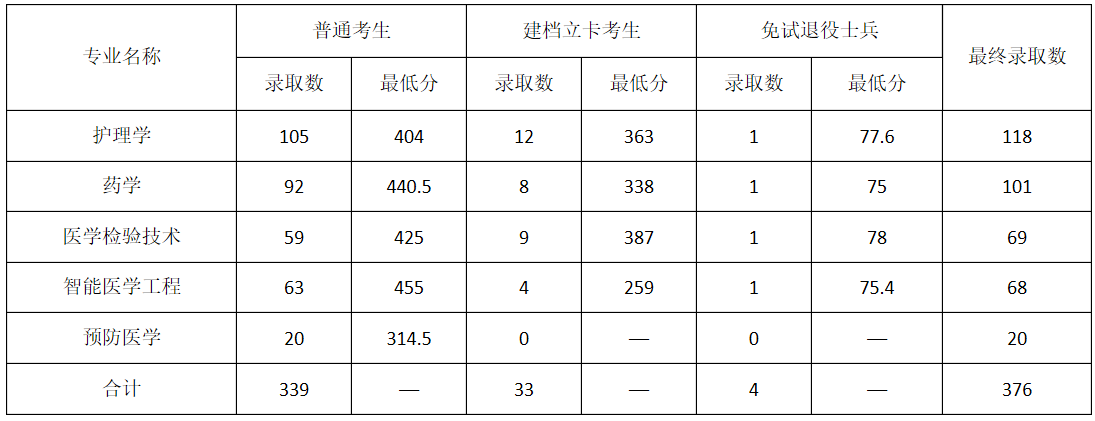1.根据招生章程,在公共课达到省考试院划定的公共课考试合格分数线且专业课每门考试成绩不低于50分的基础上,按照考生公共课+专业课成绩总和从高分到低分排序,择优录取,若考生成绩总和相同,则按单科顺序及分数从高到低排序,择优录取,单科顺序为:专业课科目1、专业课科目2、英语、大学语文或高等数学,拟录取330人,其中护理学100人、药学90人、医学检验技术60人、智能医学工程60人、预防医学20人。