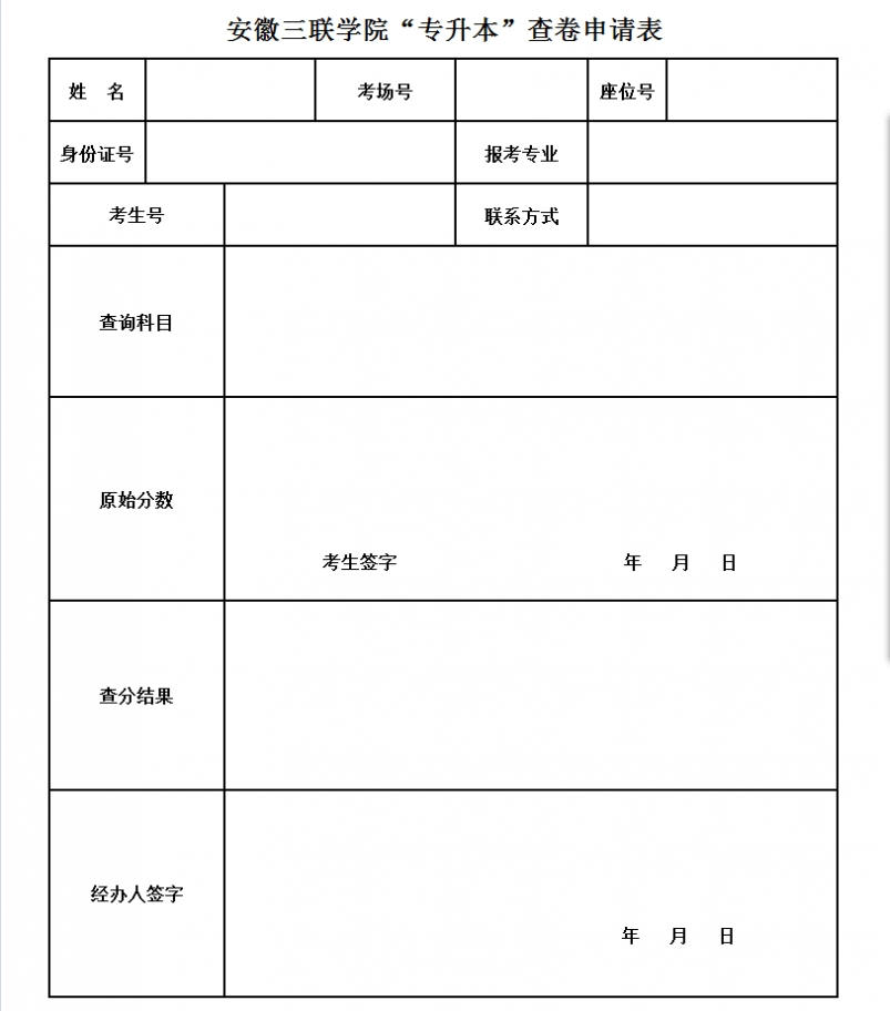 考生对自己的成绩若有异议,可填写《安徽三联学院专升本查分申请表》(见附件),于7月20日上午9:00—下午4:00交至我校教务处或传真至招生办(传真号:0551-63826339),由我校汇总核查。查分限查漏改、统分错误;经核查有误的,通知考生,核查无误的不予通知(咨询电话:0551-63830750)。